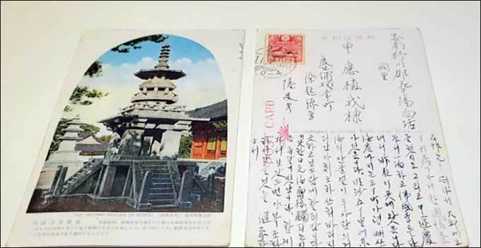 ▲ 이육사가 신석초에게 쓴 엽서(이육사문학관)