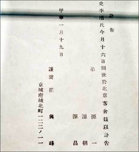 ▲ 이육사 부고(이육사문학관)