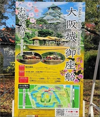 ▲ 오사카성에는 해자(못)가 두 개나 있는데 이곳을 작은 배를 타고 유람할 수 있다고 설명한 입간판