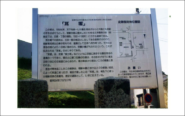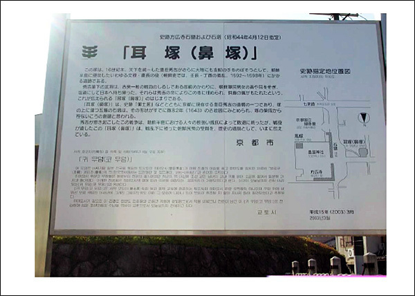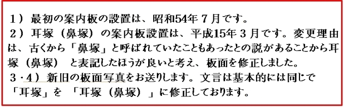 “최초의 안내판 설치는 소화 54년 7월(1979.7.)이며, <耳塚(鼻塚)>이라고 병기하게 된 것은 평성 15년 3월(2003.3.)이다. 변경한 까닭은 예부터 <鼻塚>이라고 불려오던 적이 있다는 설이 있어서 <耳塚(鼻塚)>이라고 표기하는 게 좋다고 생각하여 안내판을 수정했다.”