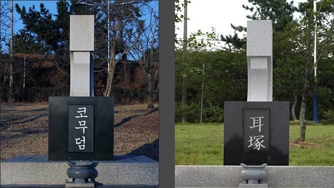▲ 최진갑 박사의 국민신문고 민원에 의해 새로 수정된 '코무덤' 위령비(왼쪽), 수정되기 전까지 세워져 있던 '耳塚' 위령비(오른쪽)