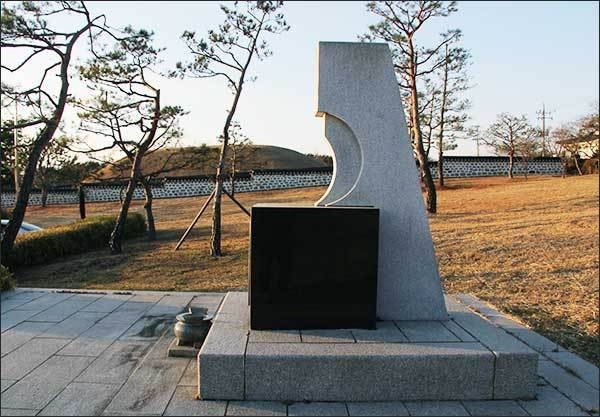 ▲ '코무덤' 위령비의 옆모습, 멀리 건너편, 봉분이 보이는 곳이 조명군총( 朝明軍塚) )이다.
