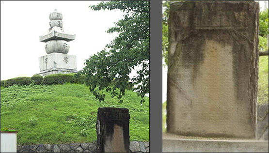 ▲ 메이지시대에 세운 돌비석(1898.3.20)에도 이 무덤이 '鼻塚(코무덤')임을 밝히고 있다. 비문에는 비총의 유래와 상국사 주지 쇼타이 등 승려를 불러 공양을 했다는 기록이 있다. (왼쪽 코무덤, 오른쪽 돌비석 )