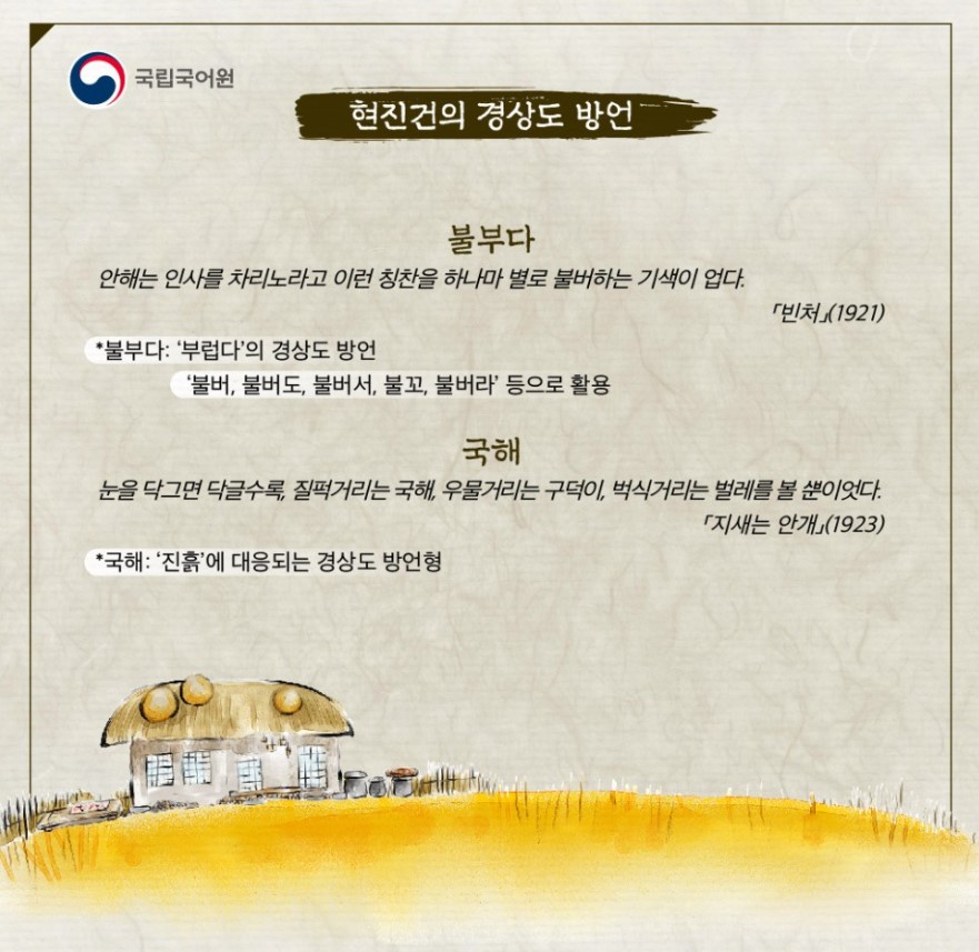 우리말을 배우자/쉼표,마침표(국립국어원 온라인소식지) 걸어서 문학 속으로, 현진건의 경상도 방언 튼씩이 2023. 7. 10. 08:41 https://blog.naver.com/areumkor/223140818774 현진건의 경상도 방언 작가 소개 현진건은 음력 1900년 8월 9일 대구에서 태어났습니다. 현진건은 1920년 『개벽』 지에 단편 소... blog.naver.com