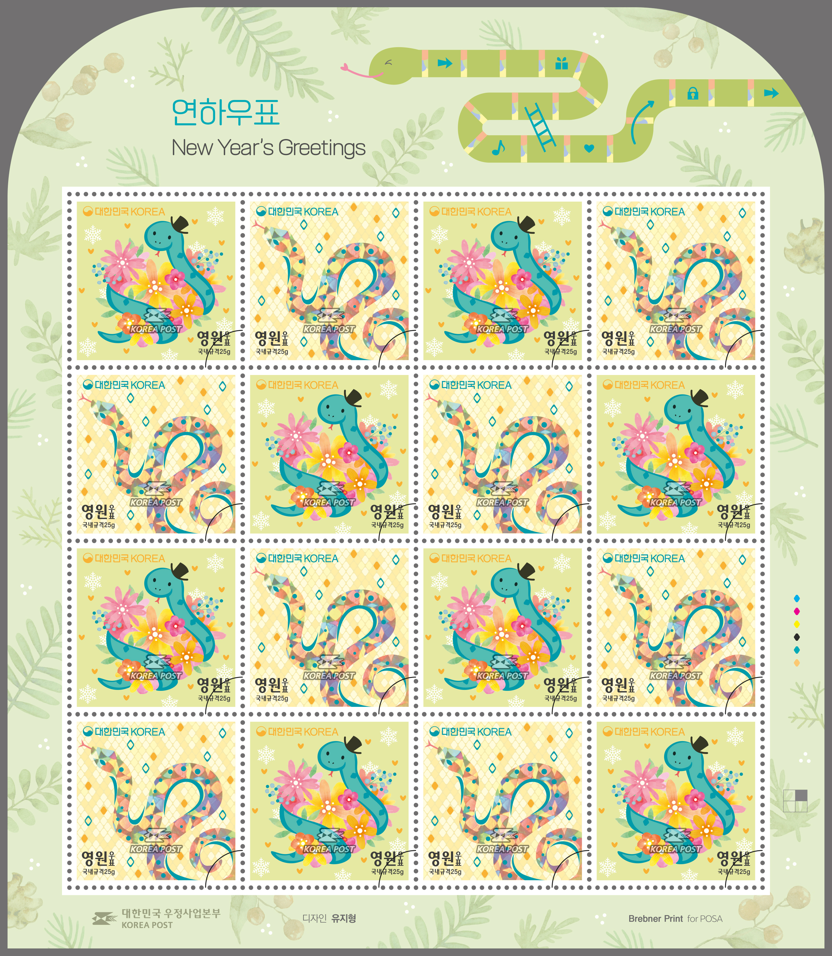 이번 연하 우표는 화사한 꽃다발을 안고 있는 뱀의 모습과 앞으로 나아가는 뱀의 움직임을 표현하고 있습니다. 마치 뱀이 허물을 벗고 새롭게 태어나는 것처럼, 제구포신(除舊布新)의 의미를 담아 묵은 것을 떨쳐내고 새로운 시작을 맞이하는 희망찬 한 해를 기원합니다.