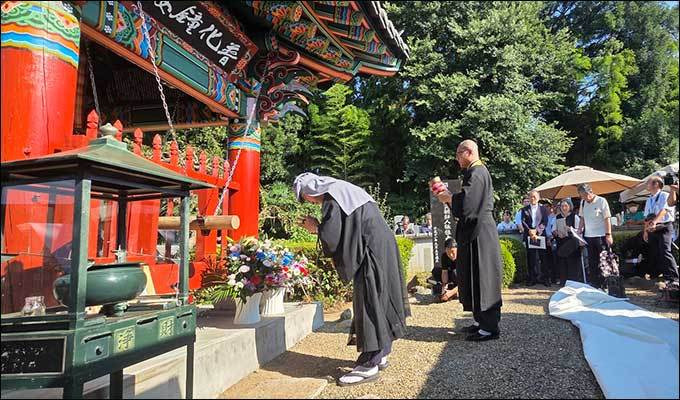 ▲ 관음사 주지가 보화종루 앞에서 헌화를 하며 '조선인 희생자 위령 종루 <보화종루> 개수 완공 기념식을 여는 모습