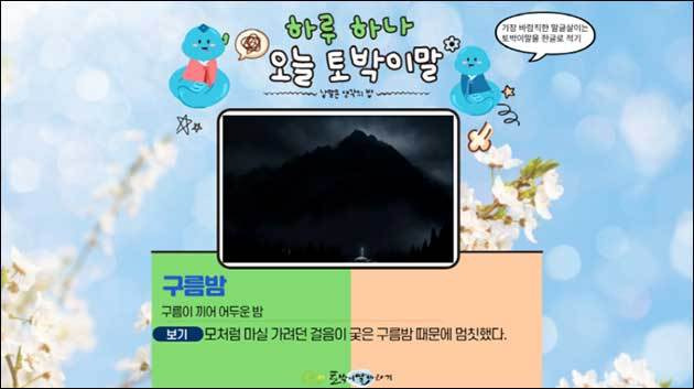 어느 날 밖을 내다보았는데 달도 별도 보이지 않고 하늘이 온통 구름에 덮여 있다면 우리는 어떤 밤을 맞게 될까요? 이럴 때 쓰면 아주 좋은 토박이말이 있습니다. 바로 ‘구름밤’입니다.