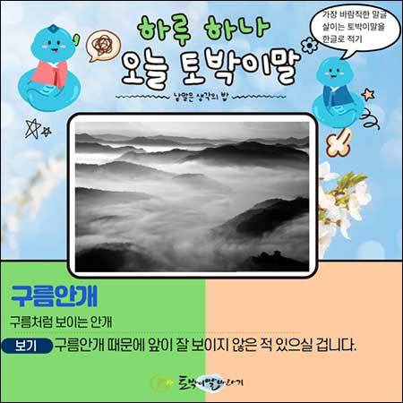 언젠가 우리에게 구름안개가 찾아오거든, 그 모습에 마음까지 젖게 두지만 마세요. 말꽃지은이들이 그랬던 것처럼, 우리도 그 속에 숨은 새로운 이야기를 찾아보는 것은 어떨까요. 하늘이 땅을 포근히 안아주러 온 날이라고, 이 아름다운 우리말을 가만히 읊조려보는 것도 좋겠습니다.
