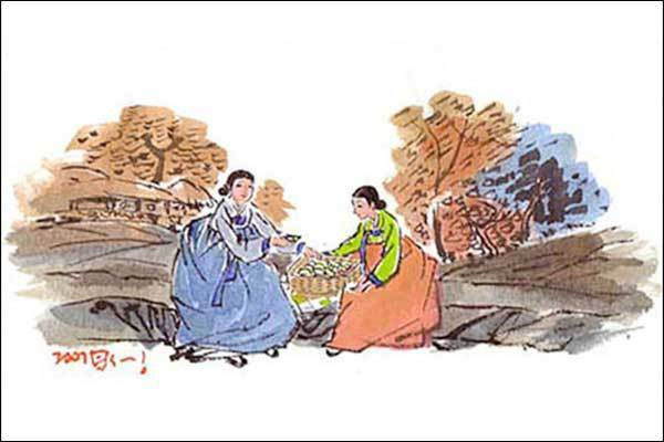 ▲ 시집간 딸과 친정어머니가 한가위가 지난 뒤 만나는 ‘반보기’(그림 이무성 작가)