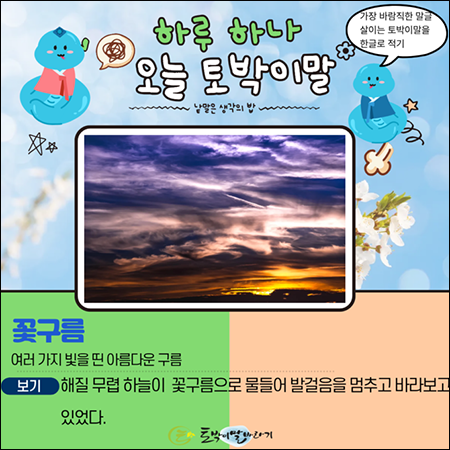 오늘 우리가 만날 토박이말은 하늘과 땅의 가장 아름다운 모습을 붙들어 한데 담은 ‘꽃구름’입니다. 이 말은 두 가지의 눈부신 바람빛(풍경)을 우리에게 안겨 줍니다. 하나는 하늘에 있고, 다른 하나는 땅에 있습니다.