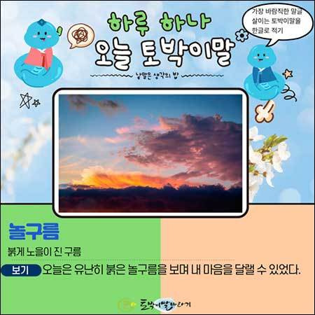'노을'이라는 익은 말 뒤에 숨어 있던 '놀구름'이라는 값진 우리말. 오늘, 하루를 마무리하며 하늘을 올려다보시는 건 어떨까요? 그곳에 해가 남기고 간 붉은빛 손씻이(선물)가 있다면, 그저 '노을'이라 부르기보다 그 이름을 불러주세요. "아, 놀구름이 참 곱다." 하고요.