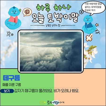 오늘 우리가 함께 나눌 토박이말은 바로 이처럼 커다란 구름 모습을 나타내는 '떼구름'입니다.