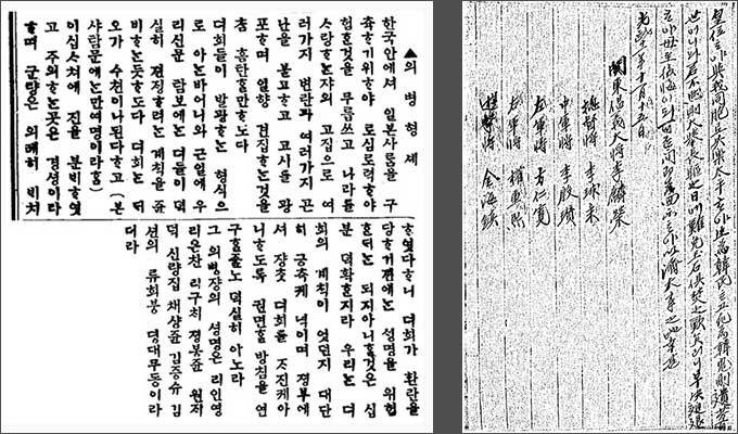 ▲ 의병 형세 기사(대한매일신보 1907.11.14.) -완쪽, 13도창의군의 활동을 보고한 일제 정보문서 『폭도에 관한 편책』 (국가보훈부)