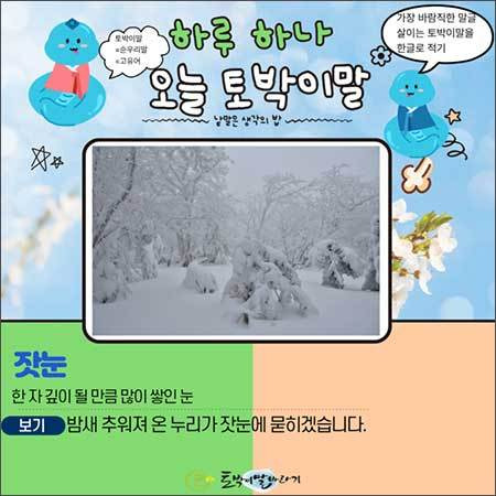 이 멋진 말을 우리 나날살이(일상)에는 어떻게 쓸 수 있을까요? 먼저 오늘 아침의 기별부터 토박이말로 부드럽게 다듬어 보고 싶습니다. "밤 사이 기온 뚝 중부 대설"라는 말을 "밤새 추워져 온 누리가 잣눈에 묻히겠습니다"라고 적어본다면 어떨까요? 눈이 주는 어려움보다, 눈이 빚어낸 고요한 바람빛(풍경)이 먼저 눈에 들어올 것입니다.