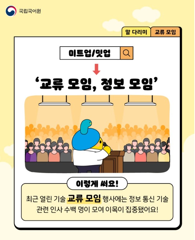 안녕하세요. 너랑이가 알려 주는 ‘말 다리미’ 시간이에요! ‘미트업/밋업’이란? 최근 많이 쓰이는 말로 ...