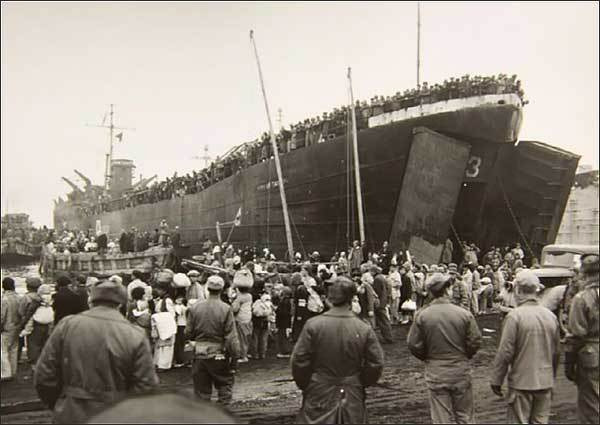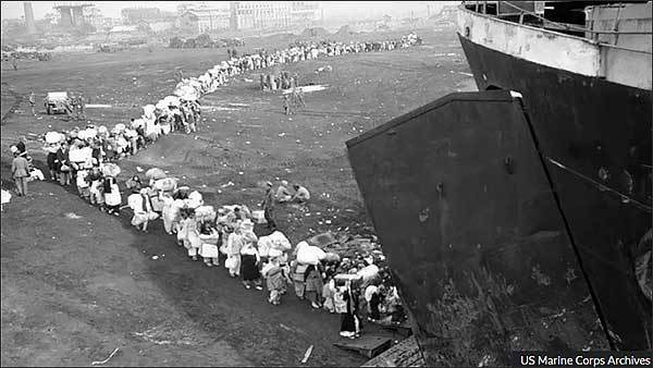 ▲ 차례로 승선을 기다리는 북한주민들, 미 해병대 자료실
