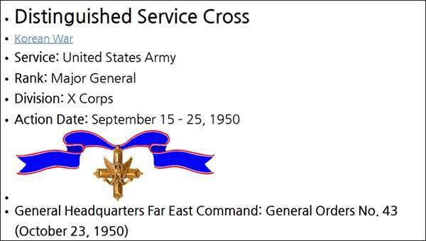 그의 감동적인 지도력, 위험에 대한 완전한 무관심, 그리고 전장 통제를 통해 아몬드 장군은 제10군단의 작전 지역에서 적군을 섬멸하는 전술 작전을 신속하게 종결시켰고, 그의 지휘하에 있던 병력의 수많은 생명을 구했습니다." ... 수훈십자장 증서