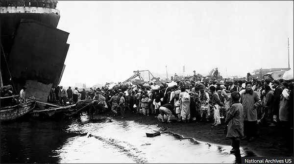 ▲ 탈출을 위해 흥남부두에 몰려든 북한주민들, 미 국립 자료보관소