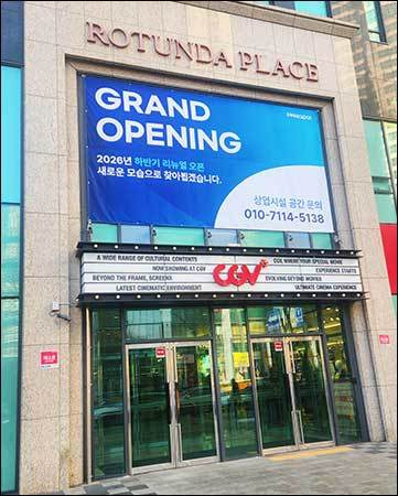 그에 더하여 그 위엔 건물 이름인지 “ROYUNDA PLACE”라는 글씨도 보였다. 아마도 지붕이 둥근 원형 건물을 말하는 것으로 보이는데, 사진에 찍히는 정도로는 알 수가 없다. 아래에 보면 영화관 CGV가 커다랗게 쓰였고, 그 건물에 들어선 업체로 보이는 곳들이 작은 글씨의 영어로 잔뜩 적혀있다.