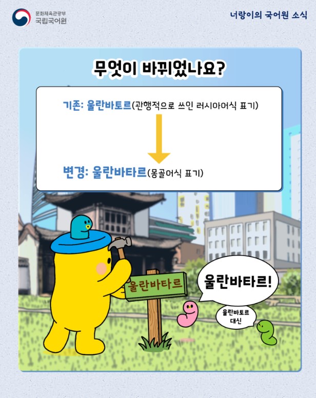 안녕하세요? 너랑이가 전해 드리는 국어원 소식 시간이에요. 오늘은 몽골 수도의 한글 표기 변경 소식을 가...