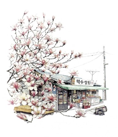 계절에 따라 겉옷을 갈아입는 구멍가게 풍경. 꽃이 피고 녹음이 짙어지고 산이 붉어지고 시린 가지 위 잔설이 날리고……. 구멍가게의 사계를 그리다 보니 작업실 벽면은 매일매일 봄, 여름, 가을, 겨울이다. - 116쪽 -
