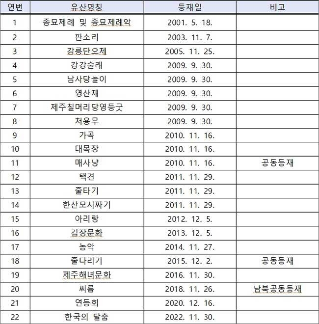 ▲ 유네스코 인류무형문화유산 등재 현황(’22.11월 현재)