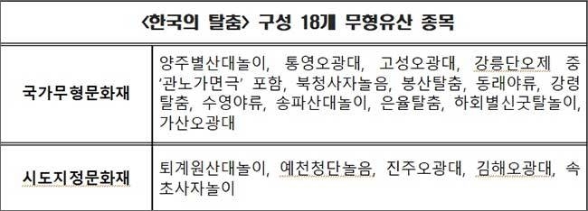 ※ ‘한국의 탈춤’은 춤, 노래, 연극을 아우르는 종합예술로, 관객과 적극적인 환호와 야유를 주고받으며 비판할 것은 비판하되 크게 하나 됨을 지향하는 유쾌한 상호 존중의 공동체 유산임. 또한 정식 무대 없이 공터만 있어도 공연할 수 있어 배우와 관객이 한 공간에서 소통할 수 있는 특징이 있음. 무형유산 제도가 우리나라에 도입된 1960년대부터 국가무형문화재로 지정되면서 우리 국민에게도 무형유산의 대표적인 상징으로 인식되어 온 종목이라서 이번 등재는 그 의미가 더욱 큼.