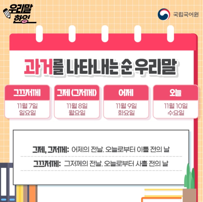 [맞는 말 틀린 말] 그그저께? 그끄저께? ‘그끄저께’가 맞습니다. ‘그저께의 전날’을 뜻하는 말은 ‘그끄저께’입니다. ‘그저께’는 ‘어제의 전날’입니다. 위 내용은 국립국어원 국어생활종합상담실 ‘온라인가나다’에 올라온 질문과 답변을 정리한 것입니다. 우리말을 배우자/쉼표,마침표(국립국어원 온라인소식지) 2022.01.18