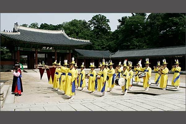 “명금일하대취타(鳴金一下大吹打) 하랍신다.” 이는 를 시작할 때 철릭(무관이 입던 공복으로 허리에 주름이 잡힌 옷)을 입고 전립(戰笠, 무관이 쓰던 벙거지)을 쓴 집사(執事)가 지휘봉이라 할 수 있는 등채를 들고 호령하는 소리입니다. 이는 징을 한번 크게 울려서 관악기를 크게 불고, 타악기를 치라는 명령이 떨어졌다는 뜻입니다. 는 국가무형문화재 제46호로 지정된 임금의 행차나 군대의 행진 그리고 개선 등에 사용한 대규모 연주입니다. 악기는 징ㆍ장구ㆍ북ㆍ나발ㆍ소라ㆍ태평소 등으로 편성되지요. ▲ 행진, 2006, 서울 창덕궁, 국립무형유산원 제공 는 ‘무령지곡(武寧之曲)’, ‘구군악(舊軍樂)’이라고도 부릅니다. 여기서 ‘무령지곡’은 씩씩하고 편안하다는 뜻으로 조선시대의 공식 이름입니다. 그리고 ‘구군악’은 ..