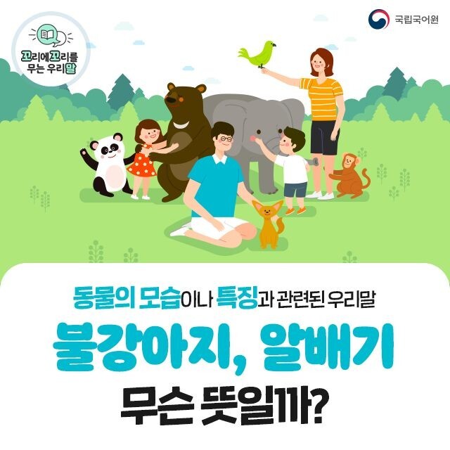 불강아지, 알배기 무슨 뜻일까? 그 말은 밤이 되면 가까이에서도 잘 보이지 않는 가라말이었다. 가라말: 털빛이 온통 검은 말 가로등 밑에는 제대로 먹지 못한 불강아지가 있었다. 불강아지: 몸이 바싹 여윈 강아지 아버지는 노련한 솜씨로 산란을 앞둔 알배기를 잡아 오셨다. 알배기: 알이 들어 통통한 생선 한눈에 보자! '동물의 모습이나 특징'과 관련된 우리말! 가라말: 털빛이 온통 검은 말 네눈박이: 양쪽 눈 위에 흰 점이 있어 언뜻 보기에 눈이 넷으로 보이는 개 동부레기: 뿔이 날 만한 나이의 송아지 부사리: 머리로 잘 받는 버릇이 있는 황소 불강아지: 몸이 바싹 여윈 강아지 서리병아리: 이른 가을에 알에서 깬 병아리 솜병아리: 알에서 깬 지 얼마 안 되는 병아리 알배기: 알이 들어 통통한 생선 애돝: 한..