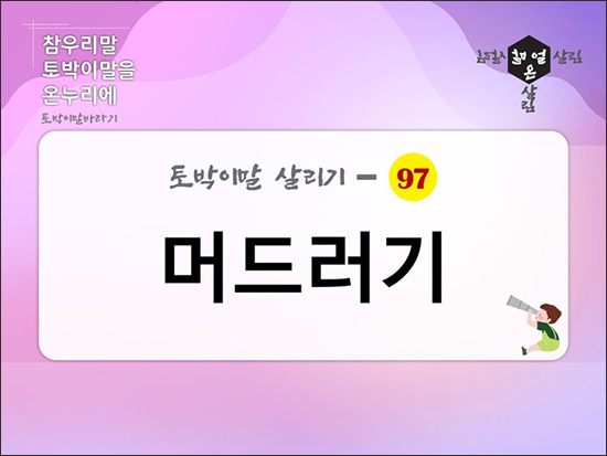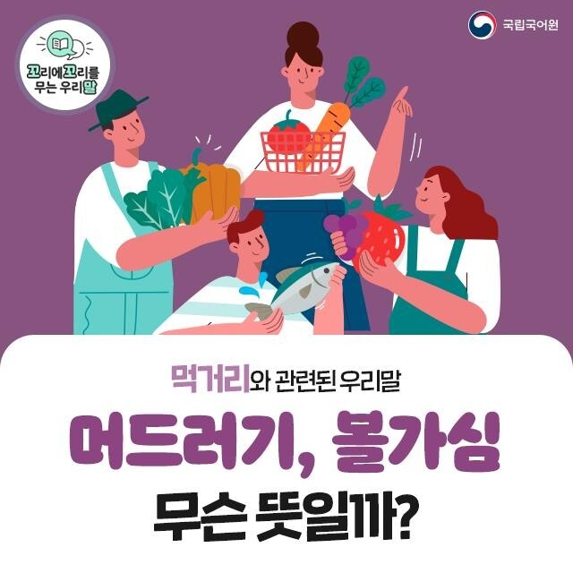 머드러기, 볼가심 무슨 뜻일까? 아빠는 먹음직스럽게 생긴 머드러기만 골라 담았다. 머드러기: 다른 것들에 비해 굵거나 큰 과일, 채소, 생선 등을 이르는 말 오전 회의가 오후까지 이어져 식사 대신 빵으로 볼가심했다. 볼가심: 아주 적은 양의 음식으로 시장기나 궁금함을 면하는 일 둘째를 낳느라 고생한 언니를 위해서 성게와 미역을 넣은 첫국밥을 준비했다. 첫국밥: 아이를 낳은 뒤에 산모가 처음으로 먹는 국과 밥 한눈에 보자! '먹거리'와 관련된 우리말! 거섶: 비빔밥에 섞는 나물 곁들이: 주된 음식 옆에 구색을 맞추기 위해 차린 음식 맏물: 과일, 채소, 나물, 해산물 등에서 그해의 맨 처음에 나는 것 머드러기: 다른 것들에 비해 굵거나 큰 과일, 채소, 생선 등을 이르는 말 반기: 잔치나 제사 후에 나누어..