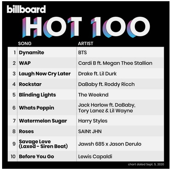 그룹 방탄소년단이 미국 빌보드의 메인 싱글 차트인 '핫 100(Hot 100)'에서 1위를 차지했다. 빌보드는 31일(이하 현지시간) 공식 홈페이지에 "방탄소년단, 'Dynamite'로 자신들의 첫 번째 빌보드 '핫 100' 정상"이라는 제목의 기사를 게재하며 방탄소년단의 '핫 100' 1위 소식을 알렸다. 매체는 "방탄소년단의 디지털 싱글 'Dynamite'가 '핫 100' 최신 차트에 1위로 첫 진입함에 따라 방탄소년단이 한국 가수 최초로 '핫 100' 차트 정상을 차지했다"고 밝혔다. 이어 "방탄소년단은 지난 3월 7일 자 빌보드 차트에서 정규 4집 'MAP OF THE SOUL : 7'의 타이틀곡 'ON'으로 '핫 100' 4위에 오른 데 이어, 'Dynamite'로 '핫 100' 차트를 점령했다..