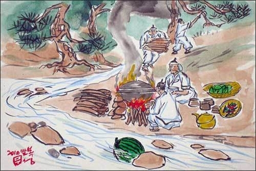 쇠를 녹일 무더위에 땀이 마르지 않으니 가슴 헤치고 맨머리로 소나무 난간에 앉았노라 옥경의 신선 벗이 나를 지성스레 생각해 주어 맑은 바람 한 줄기를 나누어 보내주었구려 무더위가 쇠를 녹인다는 말은 한여름 더위를 잘 표현하고 있습니다. 위는 1940년에 펴낸 옥담 김위원(金偉洹)의 시문집 《옥담고(玉淡稿)》에 나오는 한시 ‘부채선물에 화답’입니다. 오늘은 24절기의 열두 번째로 오는 “대서(大暑)”입니다. 사무실 안에서야 에어컨이나 선풍기로 더위를 식히겠지만 들판에서 일을 하는 농부들이나 밖에서 일을 하는 사람들에게 대서와 같은 한여름은 견디기 어려운 절기입니다. 더울수록 혀끝에서는 찬 것이 당기지만 이럴 때일수록 더운 음식으로 몸을 보양해온 게 옛사람들의 슬기로움입니다. ▲ 무더운 여름날, ‘이열치열’..