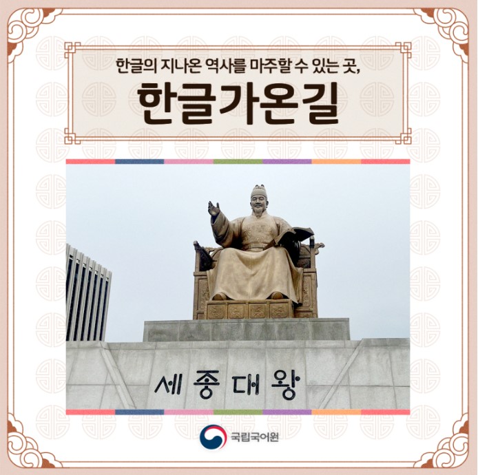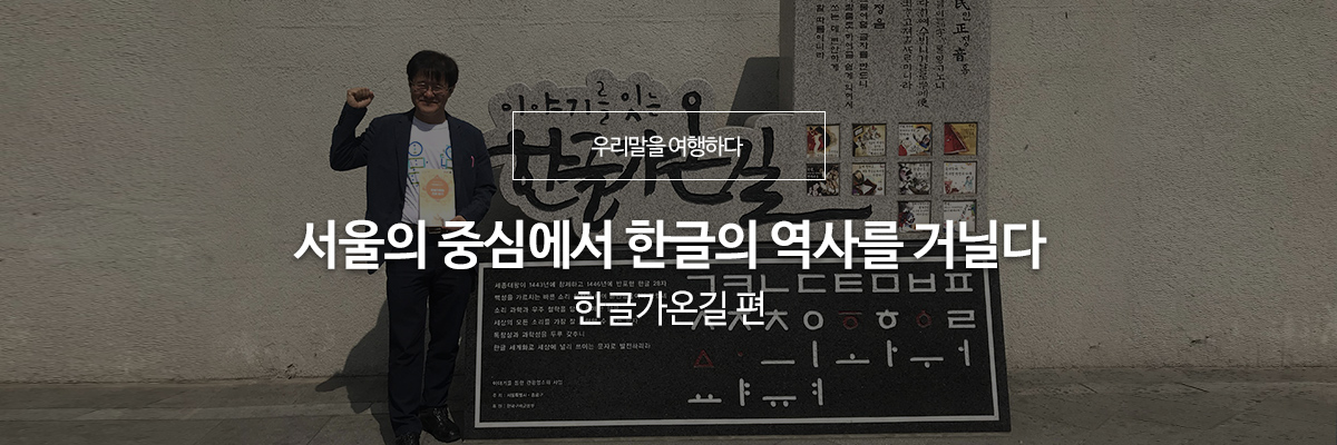 빼곡한 건물 숲과 그 사이를 바삐 오가는 회사원들의 모습이 날마다 펼쳐지는 서울 세종대로. 이 분주한 거리에 이야기보따리가 샘물처럼 곳곳에 숨어 있는 길이 있다. 바로 ‘한글가온길’이다. 한글의 역사와 발자취를 따라가 볼 수 있는 이 길을 한글학자 김슬옹 박사와 함께 걸었다. ‘한글가온길’은 2013년 서울시가 한글 창제 570돌을 맞아 한글의 우수성을 알리고자 서울 세종대로 일대에 조성했다. ‘가운데’, ‘중심’을 뜻하는 ‘가온’이라는 순우리말을 써서 한글이 우리 삶과 역사에서 중심이 되어 왔다는 뜻을 담았다. 한글을 창제하신 세종대왕의 동상, 주시경 선생의 집터, 한글학회 등 한글과 관련 있는 이야기들이 길을 따라 촘촘히 이어진다. 오전 10시, 김슬옹 박사와 만나기로 한 한글회관으로 향했다. 김슬옹..